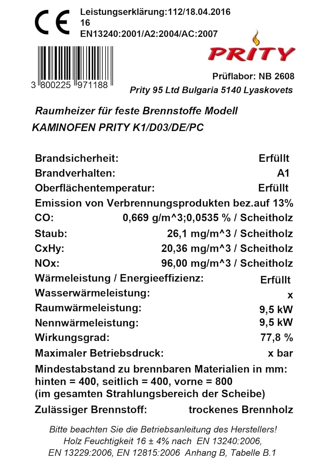 - Erf. Förderdruck bei Nennwärmeleistung: 12 Pa / Mittl. CO-Gehalt der Abgase bezogen auf 13% O2: 0,0535 % / Feinstaub: 26,11 mg/Nm3