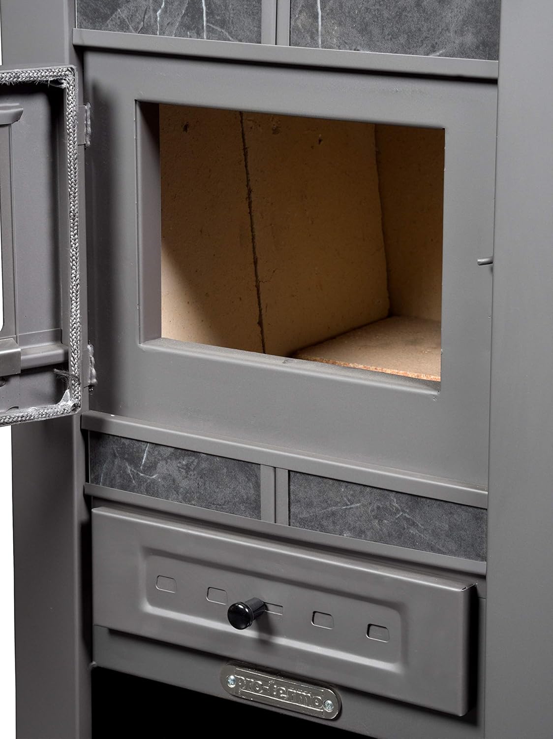 - Der Feuerraum mit einer Größe von 31×37,5×33 cm ist ausgekleidet mit hochwertigen Schamottsteinen, welche den hohen Temperaturen problemlos standhalten.